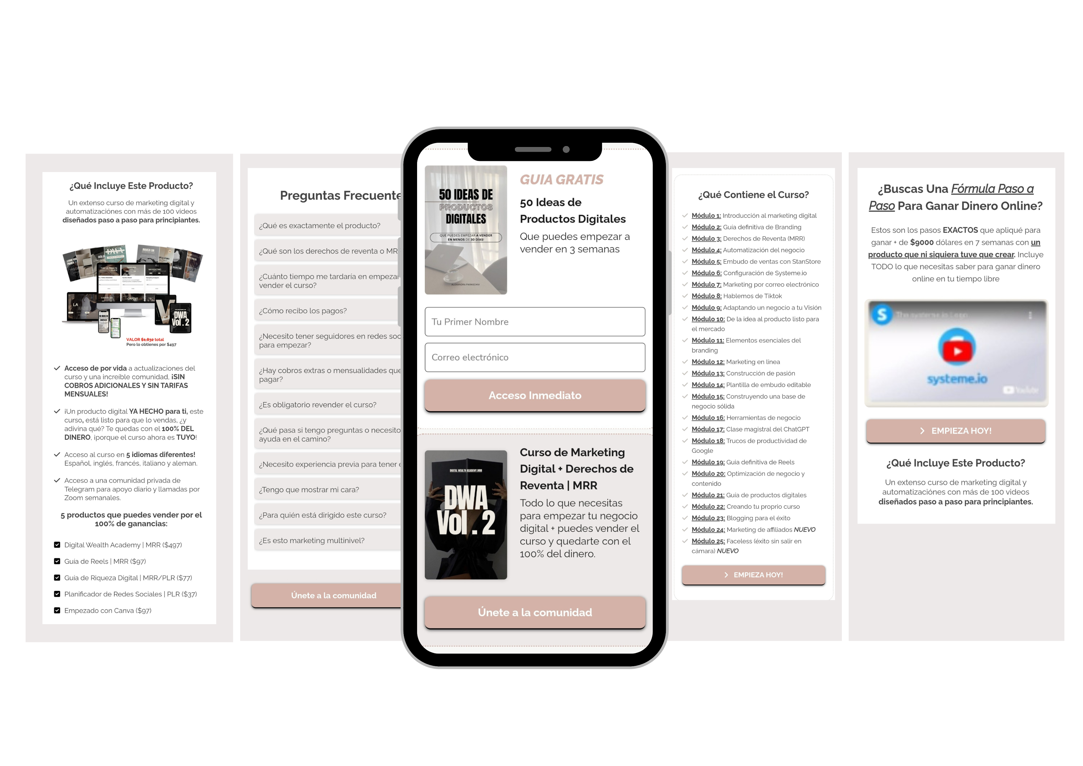 Este producto es un curso paso a paso de marketing digital. Tiene 20 módulos con más de 100 videos que te ayudarán a crear tu propio negocio de marketing digital.